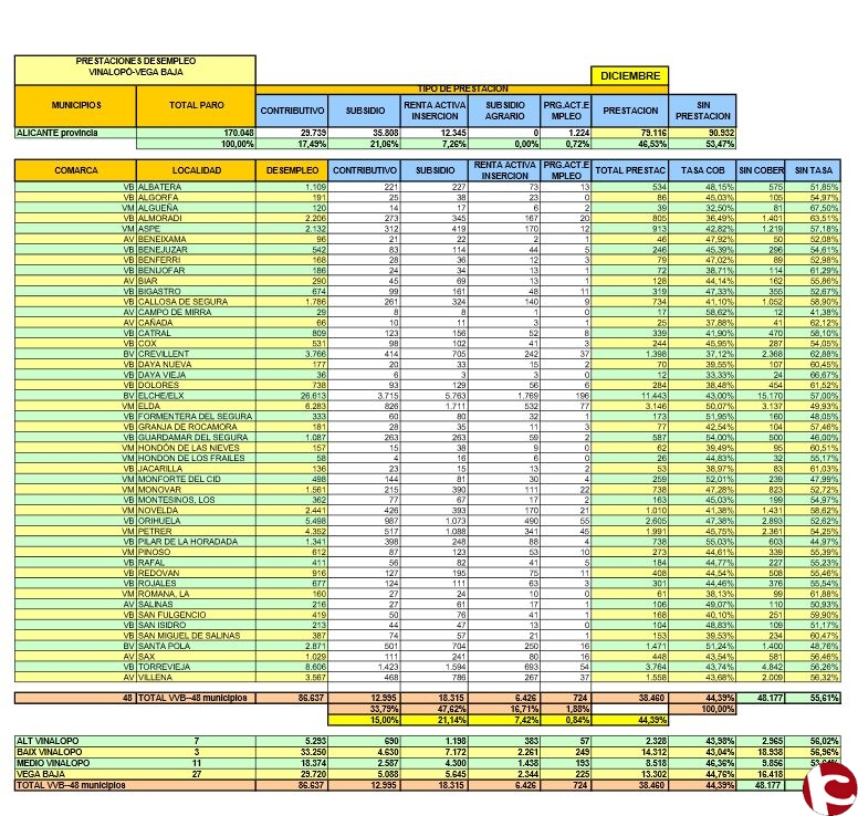 De los datos de dichos informes, se puede extraer unas conclusiones sobre los datos, la primera es que la cobertura de las personas que están en DESEMPLEO, a nivel Vinalopó-Vega Baja, el dato de cobertura es del 44.39% en el mes de DICIEMBRE del 2016.
