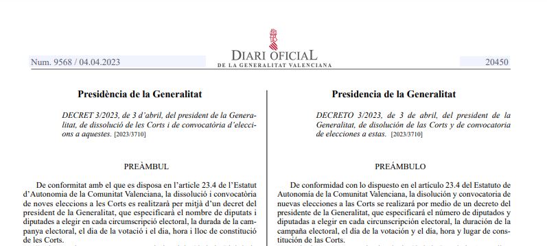 Asimismo, establece que la campaña electoral tendrá una duración de quince días, que comenzará a las cero horas del día 12 de mayo y finalizará a las veinticuatro horas del día 26 de mayo 2023. Finalmente, el decreto firmado por el president de la Generalitat desvela cuándo será la sesión constitutiva de Les Corts de la undécima legislatura: el día 26 de junio en el Palau dels Borja de la ciudad de València.