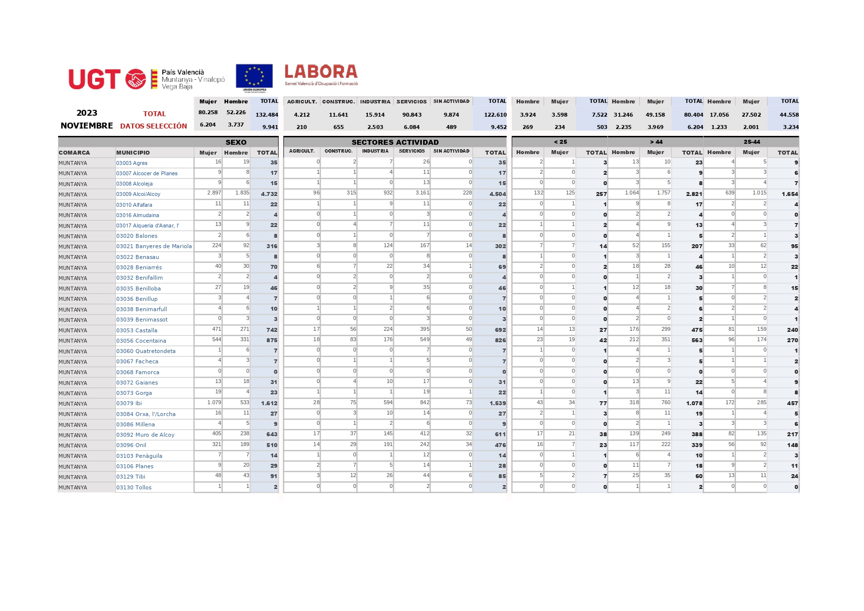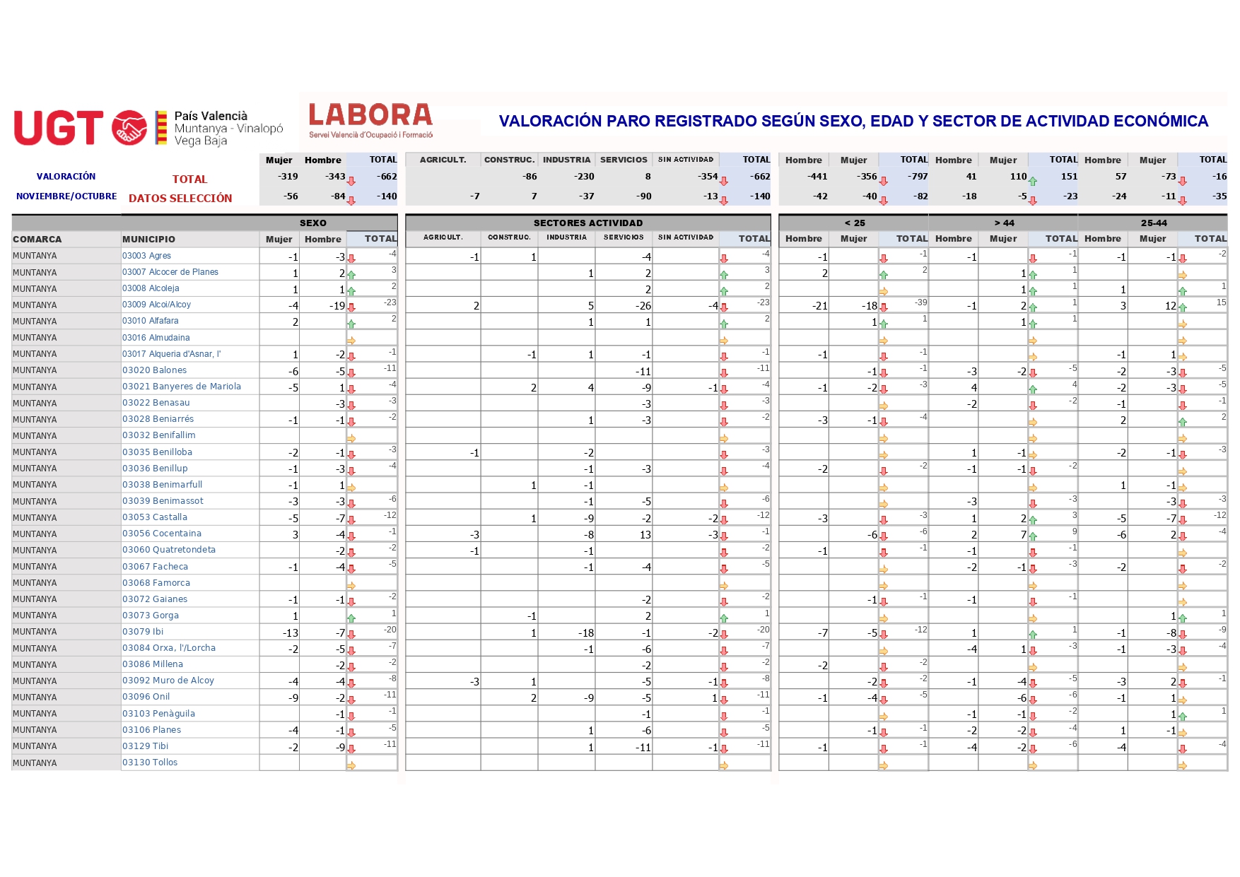 Aumento en la contratación: Se registra un total de 2.745 contratos en la comarca la Muntanya, supone un aumento en la contratación respecto del mes anterior de 56 contratos, estos datos han sido muy positivos durante el mes de octubre, se han realizado 1.002 contratos indefinidos, 1.628 temporales y se han convertido en indefinidos 115. Es decir, el 37% de los contratos registrado en este mes han sido indefinidos, el 59% temporales, y se han transformado en indefinidos el 4%. Las mujeres siguen ocupando solo el 44% de los empleos indefinidos y la mayor parte de empleos temporales. Por sectores, son los servicios quienes suma la mayoría de las contrataciones 1.685, seguida de la industria con 847 contratos, en la construcción se han registrado 113 y en la agricultura 100 contratos . En cuanto a Municipios, Alcoy suma 1.195 contrataciones (aumenta en 121), Ibi con 511 contrataciones (baja en 90 contratos) y Castalla con 274 contratos (aumenta en 62 contratos). UGT considera que, si bien es cierto que la generación de empleo de calidad avanza a buen ritmo, no hay que olvidar que aún hay una parte de la población trabajadora que sigue