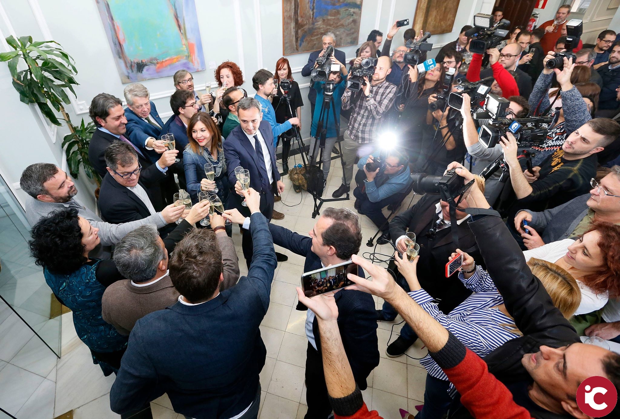 El presidente de la Diputación de Alicante, César Sánchez, ha ofrecido esta mañana en el Palacio Provincial el tradicional Brindis de Navidad a los medios de comunicación, un emotivo acto en el que también han participado los portavoces de todos los grupos políticos que integran la corporación, así como diputados provinciales.