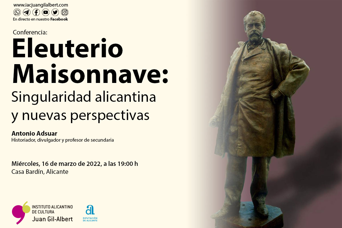 El calendario de actividades del Instituto de Cultura Juan Gil-Albert para esta semana arranca mañana miércoles 16 de marzo con la conferencia ‘Eleuterio Maisonnave: singularidad alicantina y nuevas perspectivas’ a cargo del historiador, divulgador y profesor de Secundaria Antonio Adsuar. La propuesta, que tendrá lugar a las 19:00 horas en la Casa Bardín, ahondará en el legado social y político de Maisonnave -primer alcalde de Alicante elegido por sufragio universal en 1869-, dos aspectos fundamentales para entender el devenir histórico nacional y alicantino de la segunda mitad del siglo XIX.