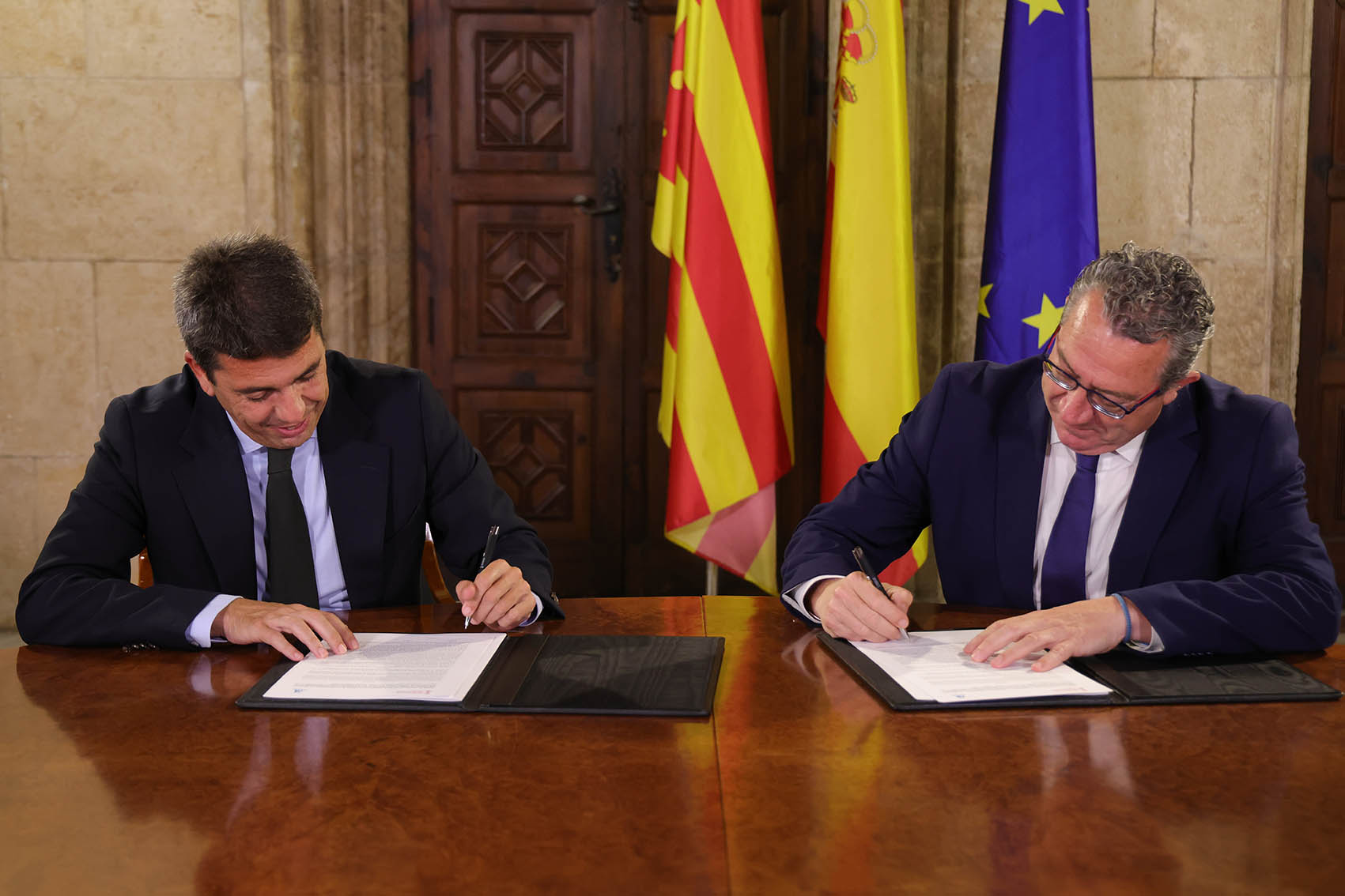 El presidente de la institución provincial, Toni Pérez, y el president del Consell, Carlos Mazón, han suscrito esta tarde el convenio de colaboración para la puesta en marcha de este programa de ayudas, que también se ejecutará en las provincias de Castellón y Valencia.