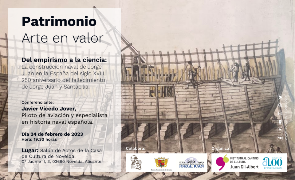 Bajo el título “Del empirismo a la ciencia: la construcción naval de Jorge Juan en la España del siglo XVIII”, el piloto de aviación y especialista en historia, Javier Vicedo, ofrecerá una charla que recorrerá la vida de uno de los personajes más ilustres de la provincia de Alicante. Jorge Juan y Santacilia se convirtió en una figura muy destacada dentro de la historia de la construcción naval y en uno de los mayores influyentes científicos de la Ilustración en la España del siglo XVIII. La actividad se desarrollará en la Casa de Cultura de Novelda mañana viernes, 24 de febrero, a las 19:30 horas.