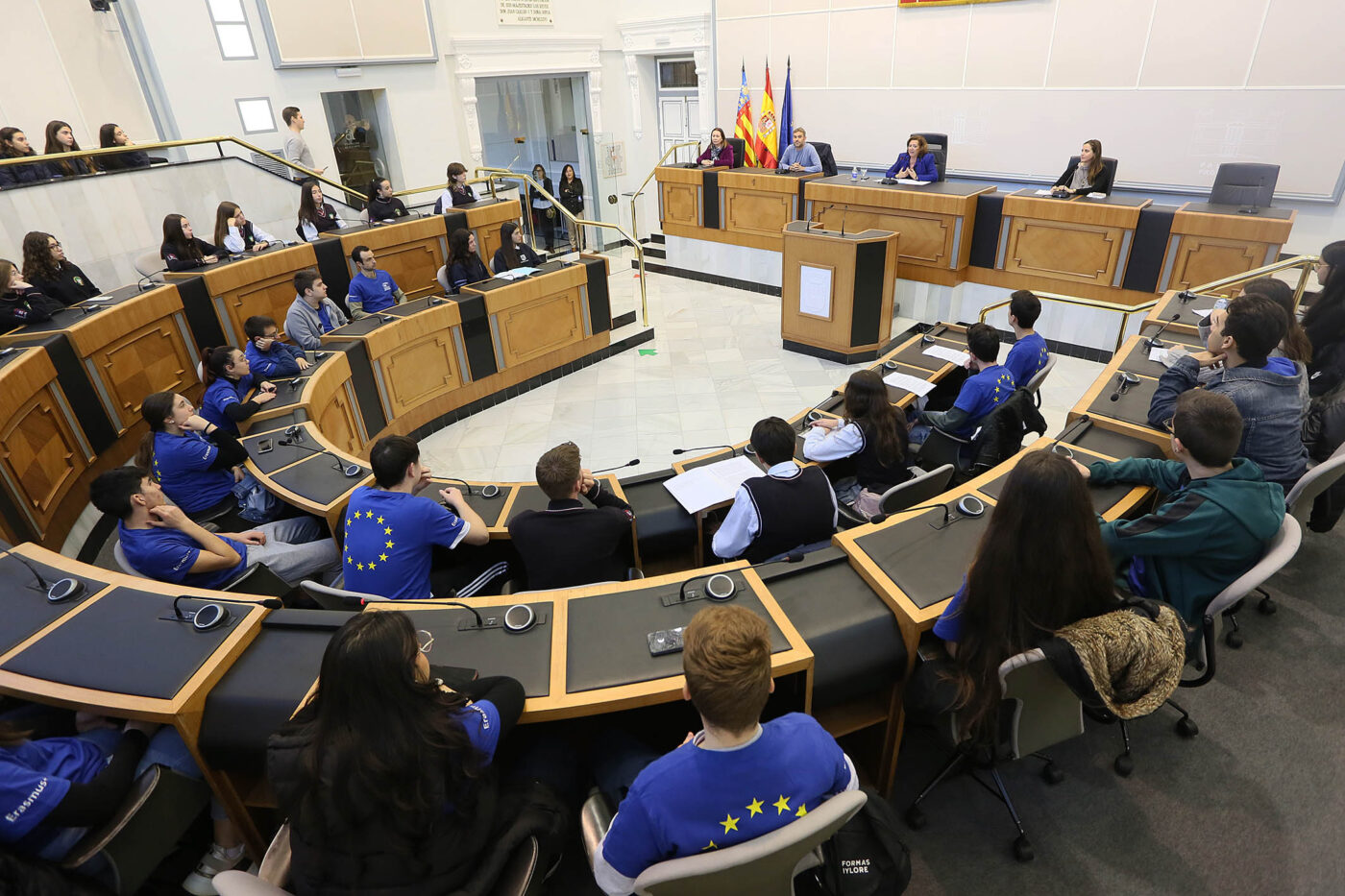 El Palacio Provincial ha acogido esta mañana un Encuentro de Escuelas Embajadoras del Parlamento Europeo en el que han participado más de un centenar de alumnos de cuatro colegios e institutos de la provincia (el IES Sixto Marco de Elche, el Colegio Sagrada Familia de Elda, el IES Bellaguarda de Altea y el Colegio Diocesano Oratorio Festivo de San Miguel, en Orihuela).