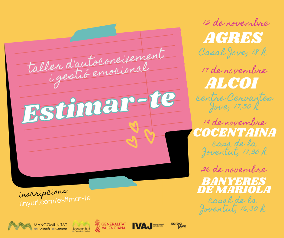 El Departament de Joventut de la Mancomunitat de l’Alcoià i el Comtat organitza, amb la col·laboració de l’IVAJ, Estimar-te, un taller adreçat a joves d’entre 12 i 17 anys, que té com a objectiu proporcionar, mitjançant dinàmiques grupals, ferramentes per a la gestió emocional i l’autoconeixement que fomenten l’autoestima.