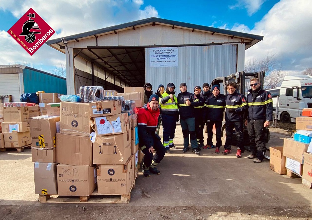 Los nueve voluntarios desplazados a la frontera con Ucrania en cuatro vehículos de bomberos han llevado material humanitario procedente de la provincia, concretamente de la Asociación Abril de Elda. Medicamentos, alimentos, ropa, juguetes y productos de primera necesidad fruto de donaciones han compuesto la carga de estas furgonetas, cuyos gastos de combustible y peajes ha costeado la institución.