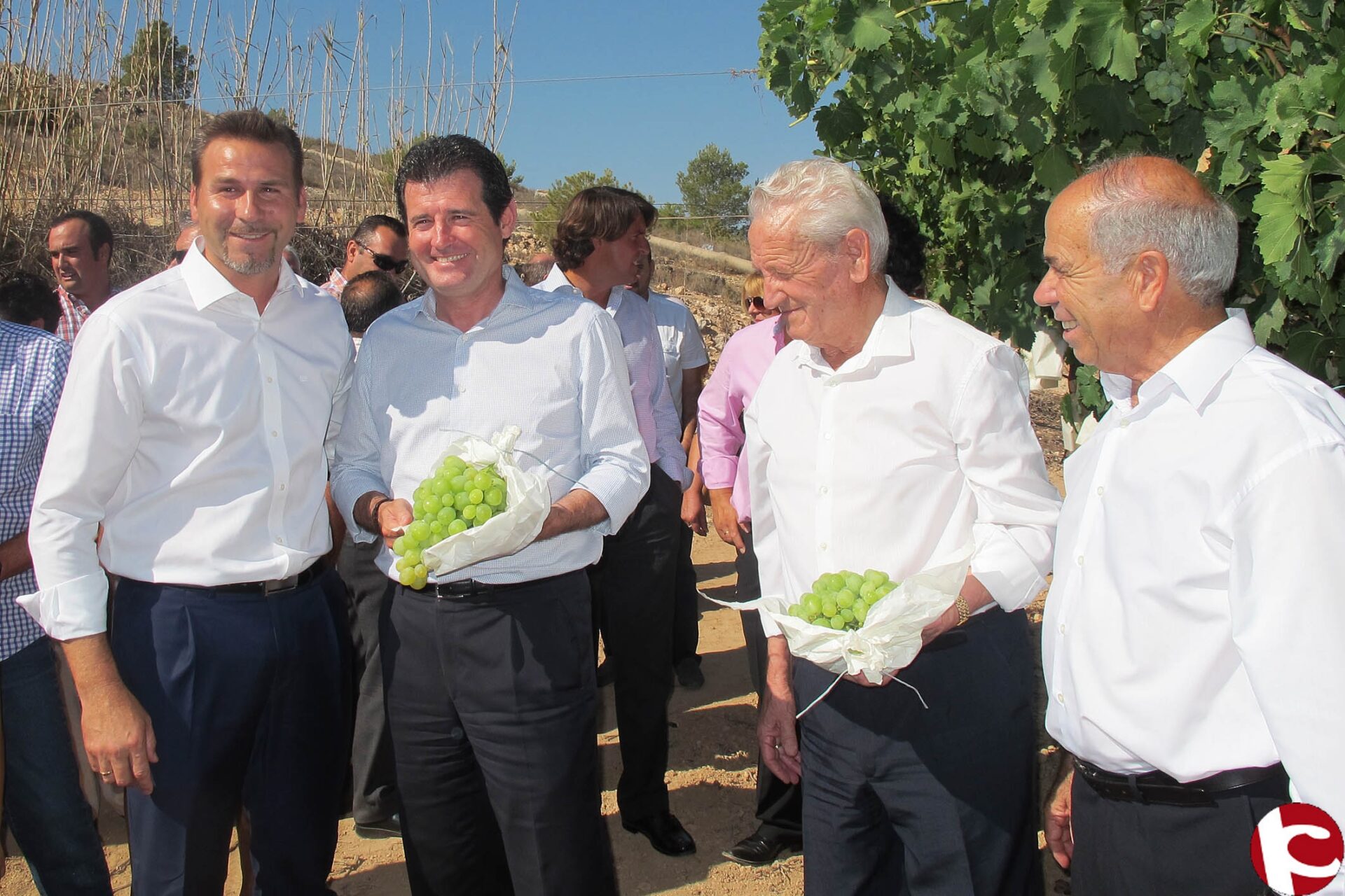 01-09-14.- El diputado de Fomento y Desarrollo Local, Alejandro Morant ha asistido esta mañana en Hondón de las Nieves a la presentación de la campaña de promoción de Uva de Mesa Embolsada del Vinalopó 2014 y al corte del primer racimo. El acto contó también con la presencia del conseller de Presidencia y Agricultura, Pesca y Alimentación, José Císcar, el alcalde de Hondón de las Nieves, Victoriano Sánchez y el presidente de la Denominación de Origen, José Bernabeu.