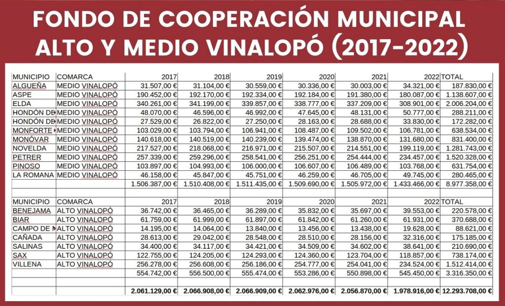 Sellés ha afirmado que “para aquellos que no sepan cómo funciona, el Fondo de Cooperación es una herramienta que dotan al 50% la Generalitat Valenciana y las diputaciones y que se reparte a los municipios de la comunidad en base a criterios poblacionales. El fondo tiene como objetivo promover el equilibrio económico de los entes locales de la Comunitat Valenciana y la realización interna del principio de solidaridad, al objeto de contribuir a que los diferentes núcleos y entidades de población cuenten con la dotación adecuada para la prestación de los servicios de competencia local”.
