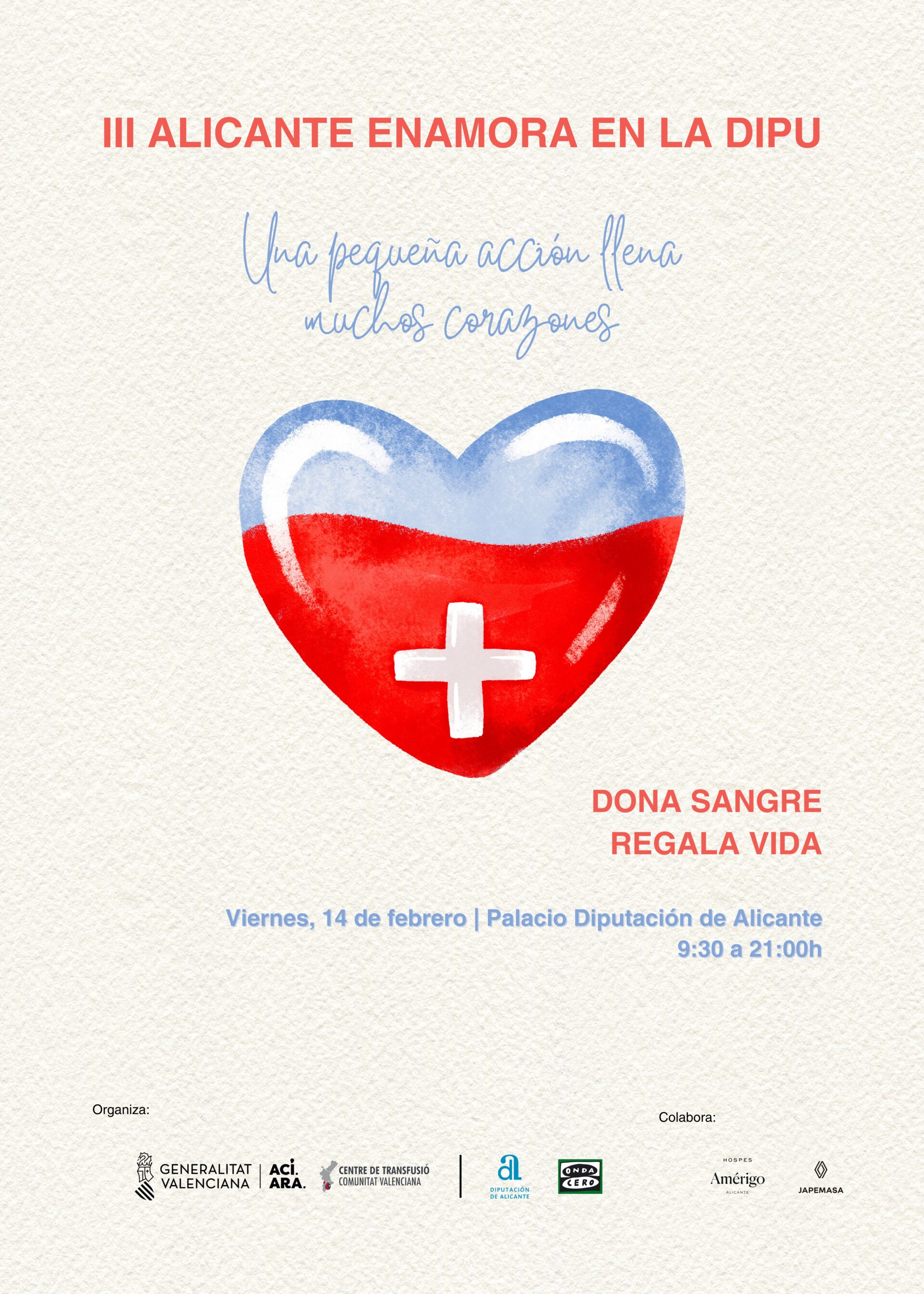 Coincidiendo con el Día de San Valentín, el Palacio Provincial acoge mañana viernes 14 de febrero la campaña de donación de sangre ‘Alicante Enamora en la Dipu’. La institución colabora con el Centro de Transfusión de la Comunitat Valenciana (CTCV) en el desarrollo de esta jornada solidaria que se desarrollará en horario de 09:30 a 21:00 horas y en la que también se podrá donar plasma.