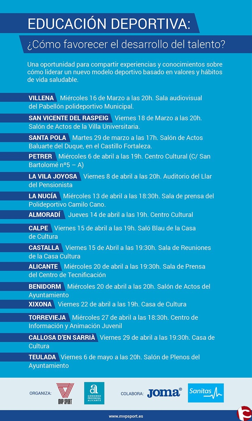 Benidorm, Santa Pola, Calp, Torrevieja, La Vila Joiosa, Sant Vicent del Raspeig, Petrer, Castalla, Villena, Almoradí, Xixona, Callosa den Sarrià, La Nucia, Teulada y Alicante son los municipios en los que se llevará a cabo esta propuesta, que incluye una serie de charlas y conferencias en las que los participantes compartirán experiencias y conocimientos con el fin de proponer iniciativas que favorezcan el desarrollo positivo del talento a través del deporte.