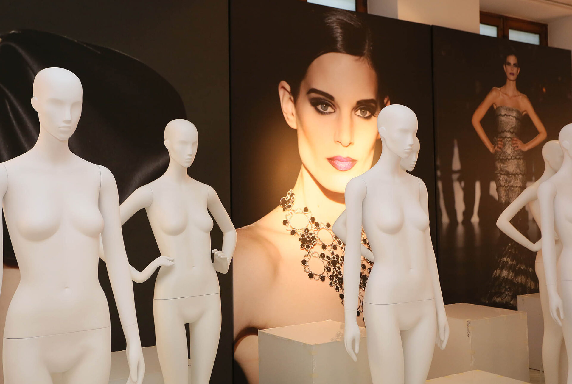La propuesta incluirá un espectacular diseño expositivo, cuyo montaje ha empezado esta semana e incluye una decena de fotografías de modelos en desfiles. Estas reproducciones, elaboradas en soportes de tela de cerca de tres metros de altura, se combinan con enormes espejos como elementos fundamentales de la historia de la moda y de su evolución en la sociedad.