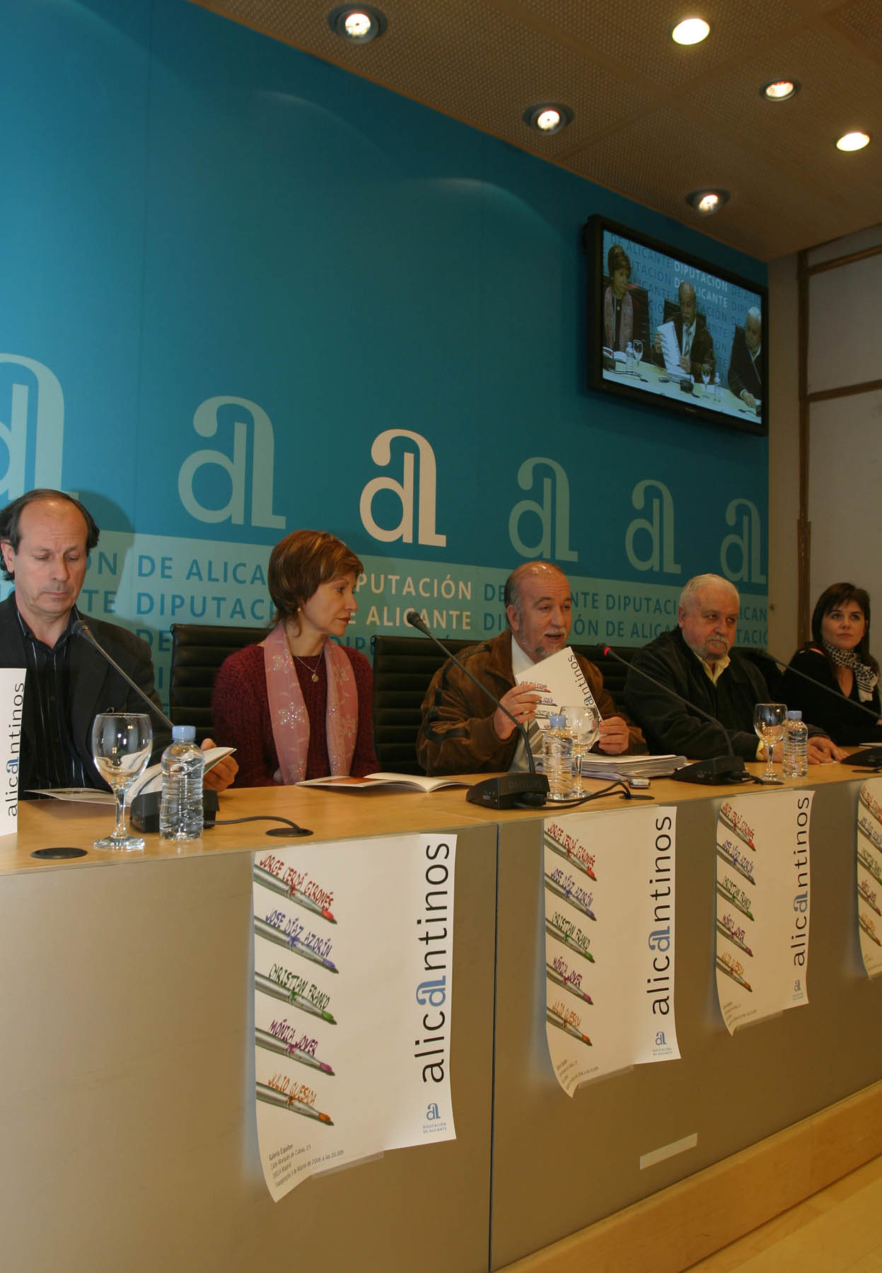 El diputado de Cultura, Miguel Valor, ha presentado esta mañana la exposición acompañado por los artistas protagonistas de la misma, Jorge Cerdá, Mónica Jover, José Díaz Azorín y Carmen Soler, madre del pintor fallecido Christian Franco, cuya obra también está presente en la muestra, al igual que la de Julio Quesada.
