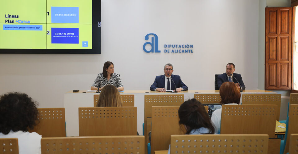 La Diputación de Alicante movilizará en 2024 más de 32,5 millones de euros a través de una nueva edición del Plan +Cerca, un programa de ayudas a los ayuntamientos de la provincia que en este ejercicio se destinará directamente a gasto corriente para financiar el mantenimiento y funcionamiento de instalaciones municipales como parques y jardines, consultorios médicos, centros docentes o instalaciones deportivas.