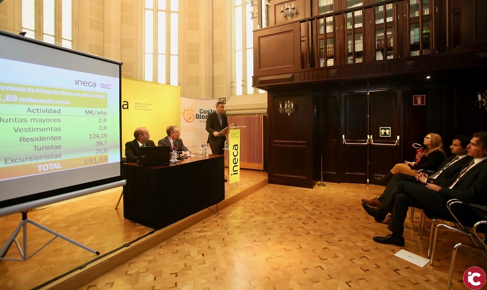 Acompañado por el presidente del Instituto de Estudios Económicos de la Provincia de Alicante, Rafael Ballester, y por los autores del trabajo, Sánchez ha resaltado que “esta celebración, con gran tradición en muchas de nuestras poblaciones, complementa nuestra oferta turística, aportándole un valor añadido, y nos permite desestacionalizar y desconcentrar la llegada de turistas”. “También nos ofrece la oportunidad de movilizar al visitante, atraído por un turismo cultural, patrimonial y de interior”, ha concretado.