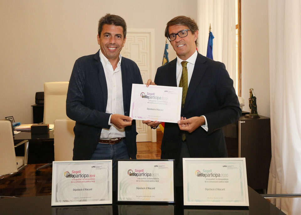 23-05-23.- La Diputación de Alicante ha sido reconocida por cuarto año consecutivo como la institución provincial más transparente de toda la Comunitat Valenciana. Así lo ha calificado la Universidad Autónoma de Barcelona y el Observatorio de Transparencia de la Universidad Cardenal Herrera CEU, que han otorgado el Sello Infoparticipa a la administración alicantina tras obtener un 96% de puntuación por sus buenas prácticas y avances en el ámbito de la Transparencia, Buen Gobierno y Comunicación Pública.
