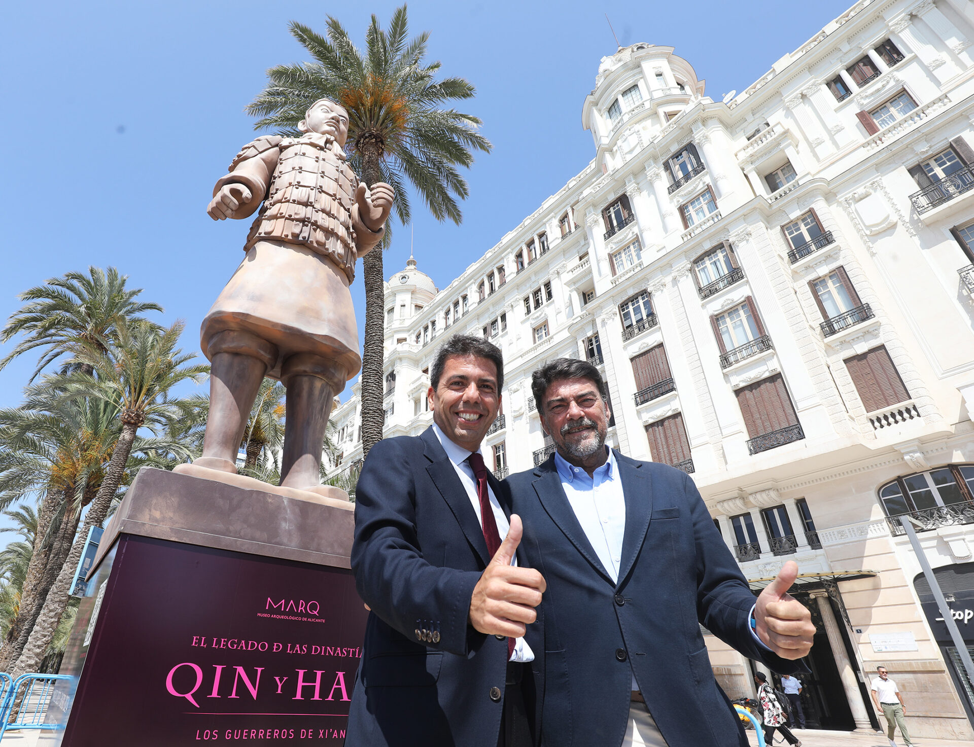 01-06-23.- El presidente de la Diputación, Carlos Mazón, ha visitado esta mañana la escultura gigante de un guerrero de Xi’an que, desde hoy y durante los próximos meses, presidirá el emblemático paseo de La Explanada de España de Alicante para promocionar la muestra internacional que se exhibe en el MARQ.