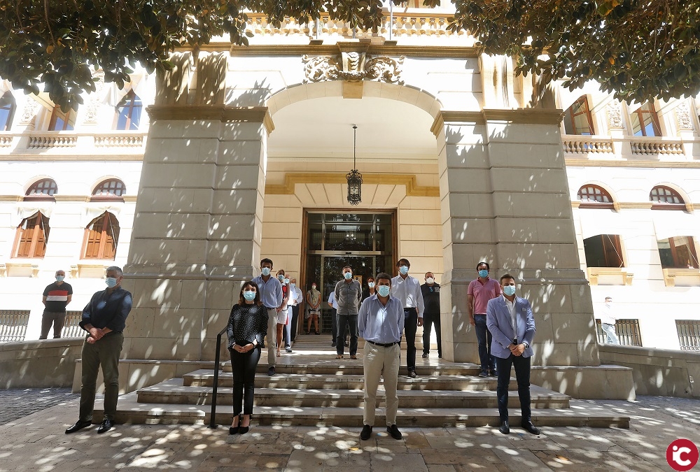 Con motivo de la finalización de los diez días de luto oficial decretados en España, diputados y trabajadores de la Diputación de Alicante se han concentrado esta mañana a las puertas del Palacio Provincial para guardar un minuto de silencio en memoria de todas las personas que han fallecido a causa del COVID-19.