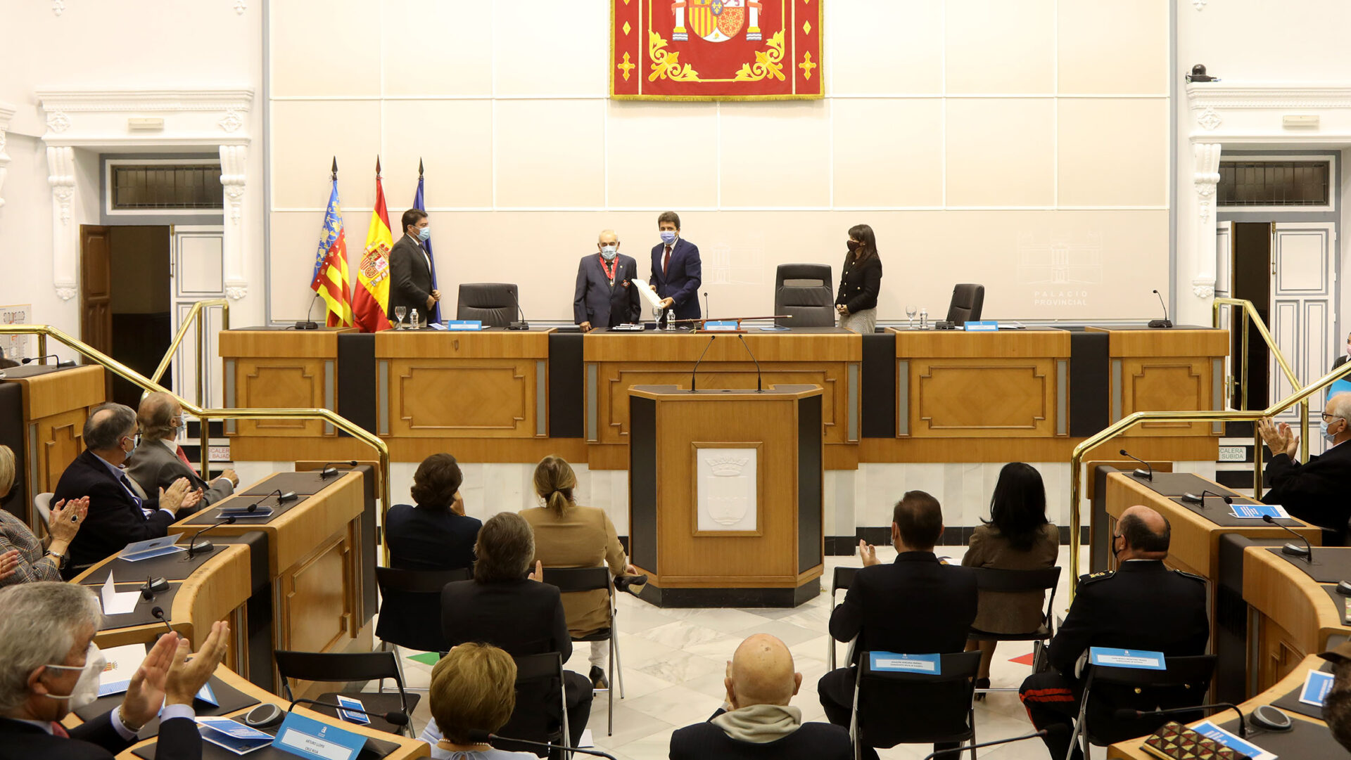 El presidente de la Diputación de Alicante, Carlos Mazón, ha presidido esta tarde en el Salón de Plenos de la institución el acto de reconocimiento al poeta y catedrático Alfredo Gómez Gil, con motivo de la concesión de la Encomienda con Placa de la Orden de Alfonso X El Sabio. Tal como ha destacado Mazón, “la provincia siente un profundo orgullo por tener entre sus nombres ilustres a una persona que ha hecho de embajador de su tierra por doquier”, al tiempo que ha reconocido “su inconmensurable aportación académica y artística universal”.