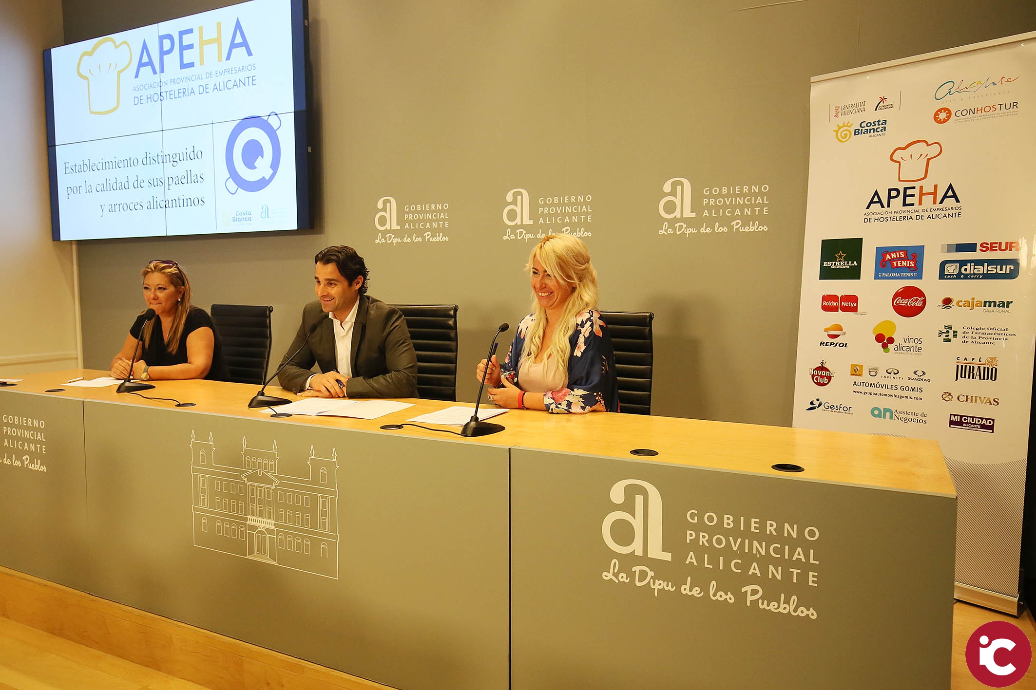 El vicepresidente y diputado de Promoción Turística, Eduardo Dolón, la presidenta de APEHA, María del Mar Valera, y la concejal de Comercio, Hostelería, Consumo y Mercados de Alicante, Marisa Gayo, han presentado esta mañana todos los detalles de este prestigioso sello que otorgará un comité de expertos en función del sabor, la textura, la temperatura y el aspecto de este tradicional plato.