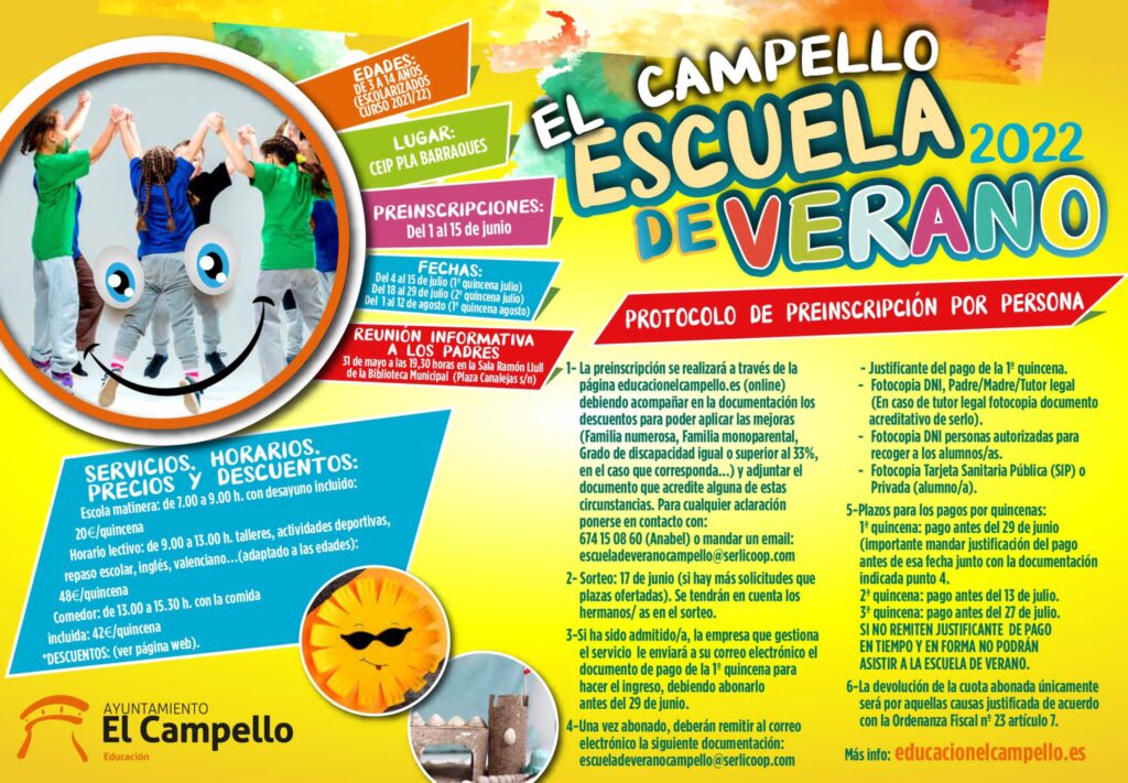 La preinscripción debe formalizarse online en la web educacióncampello.es, y las familias tienen la opción de acogerse a los descuentos previstos por familia numerosa, familia monoparental y grado de discapacidad igual o superior al 33%. Para cualquier aclaración los interesados pueden dirigirse al correo electrónico escueladeveranocampello@serlicoop.com, o llamando al teléfono 674150860 (Anabel).
