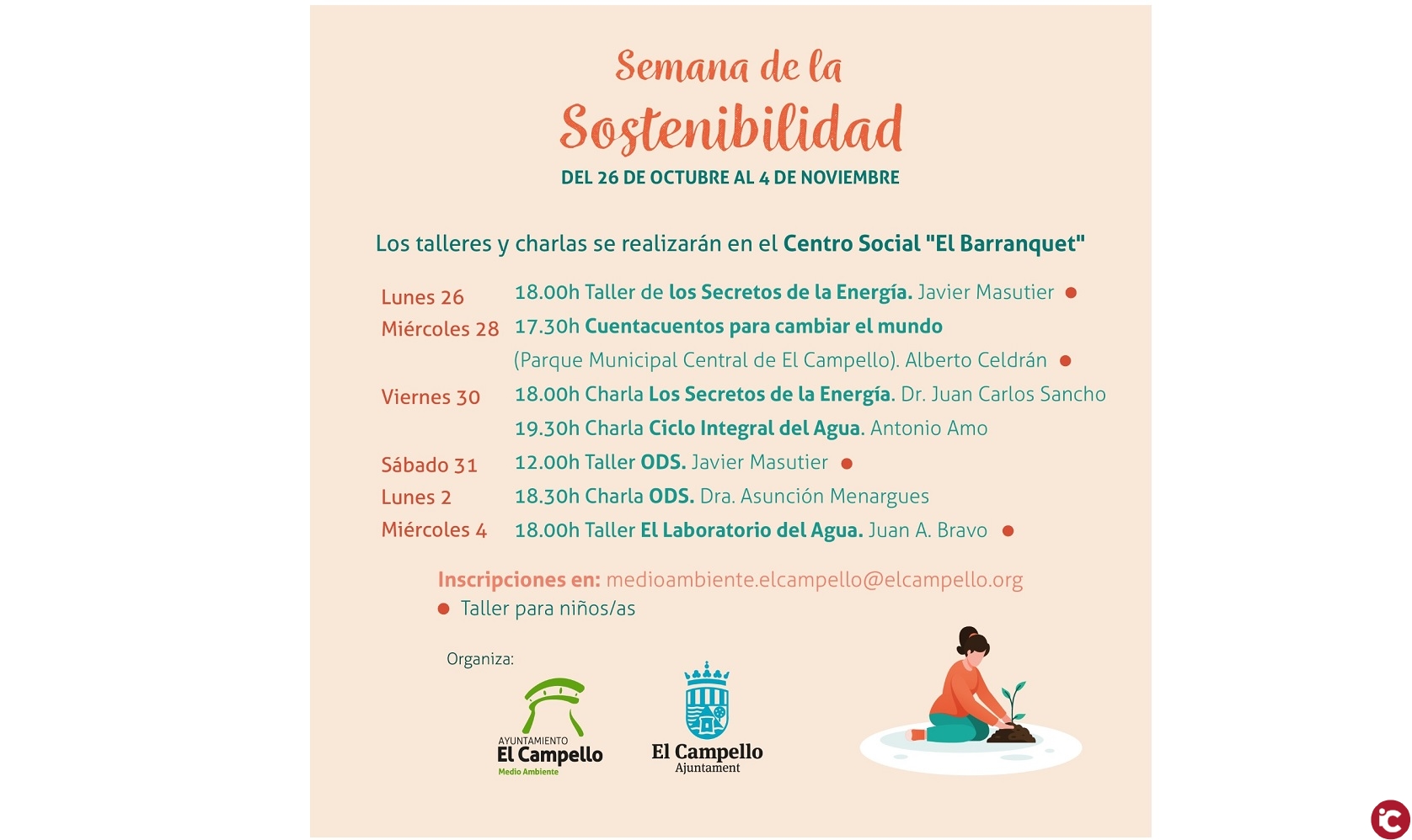 La concejalía de Medioambiente, dirigida por el edil Julio Oca (Cs) informa que todas las actividades programadas durante la “Semana de la Sostenibilidad”, que comenzaba hoy y se extendía hasta el miércoles 4 de noviembre, quedan APLAZADAS.