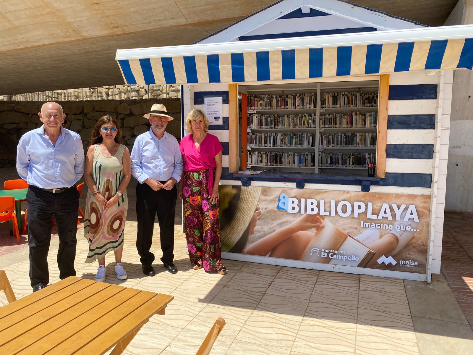 El alcalde Juanjo Berenguer y al concejala Dorian Gomis, acompañados por representantes de la firma patrocinadora, Maisa, supervisaron las instalaciones, dotadas de mesas y sillas para hacer más cómoda la lectura a pie de playa.