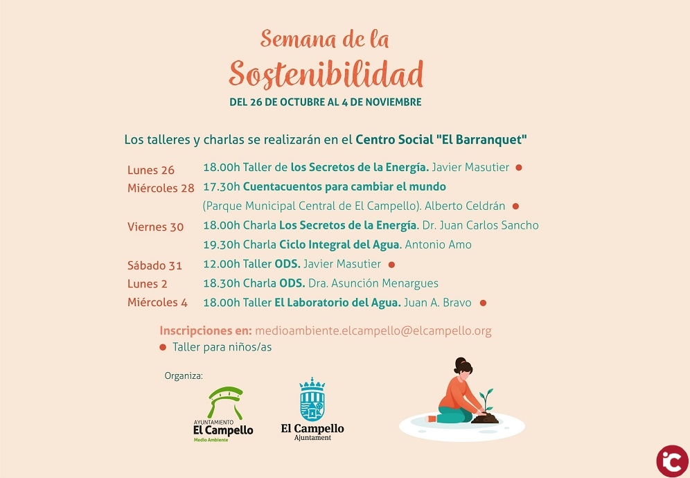 La concejalía de Medioambiente, dirigida por el edil y alcalde en funciones Julio Oca, celebrará a partir del próximo lunes 26 de octubre la Semana de la Sostenibilidad y, para ello, ha puesto en marcha toda una serie de charlas, talleres y cuentacuentos para todas las edades que se sucederán desde la citada fecha y hasta el miércoles 4 de noviembre.