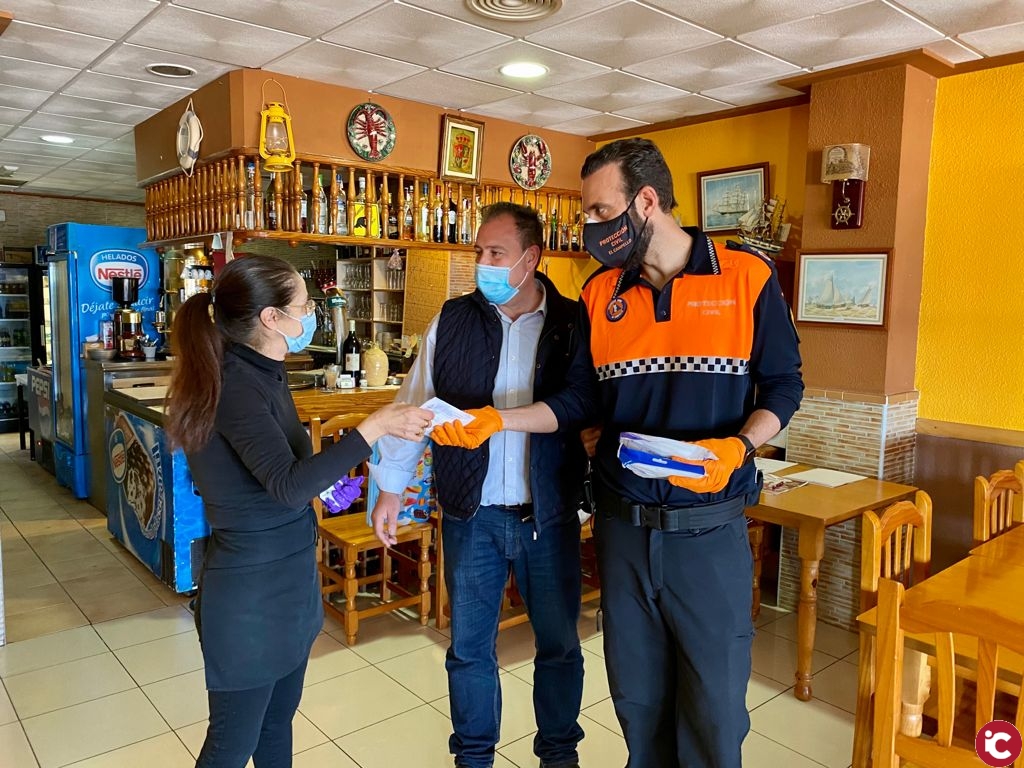 Los voluntarios de Protección Civil y el propio concejal Rafa Galvañ han recorrido hoy establecimientos de la zona norte, centro urbano y Muchavista. El reparto continuará hasta que todos ellos reciban sus mascarillas.