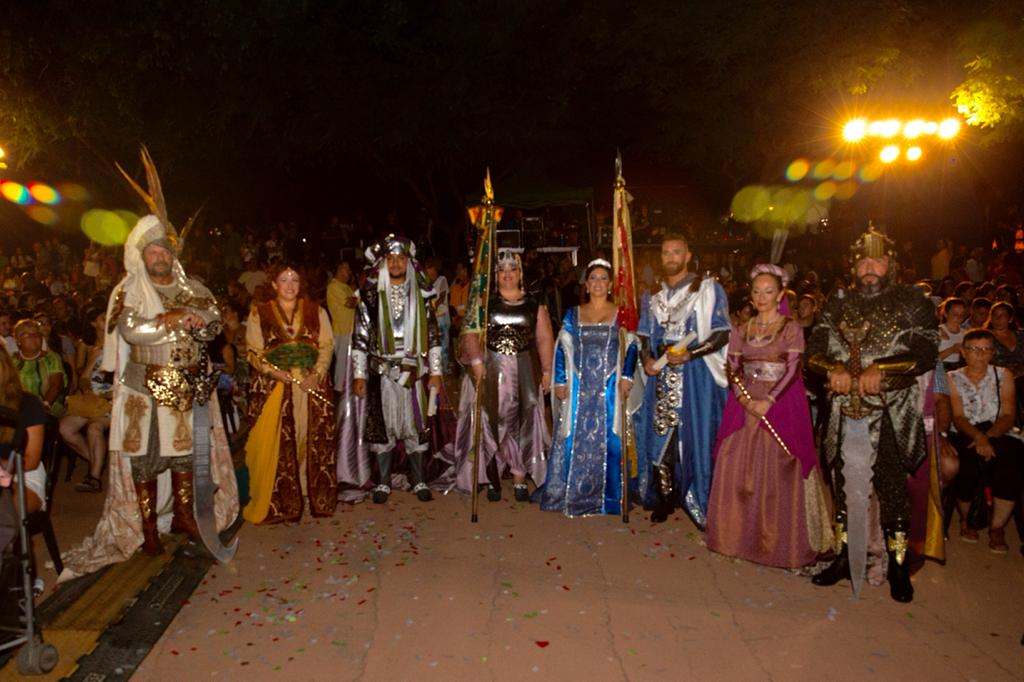 Una vez subieron al escenario los estandartes de todas las comparsas (Cristians del Campello, Els Maseros, Cavallers del Temple, Tercio de Flandes, Jaume I, Els Marinos y Cavallers de Conquesta por el bando cristiano, y por el bando moro las enseñas de Veterans, Pacos, Pollosos, Kordofan, Zaidies, Marrocs, Non Bèbéc, Ain Karim y Meixemet), les tocó el turno a los cargos de 2019,que se despidieron de lo que ciertamente ha sido el reinado más largo de la historia de las fiestas.