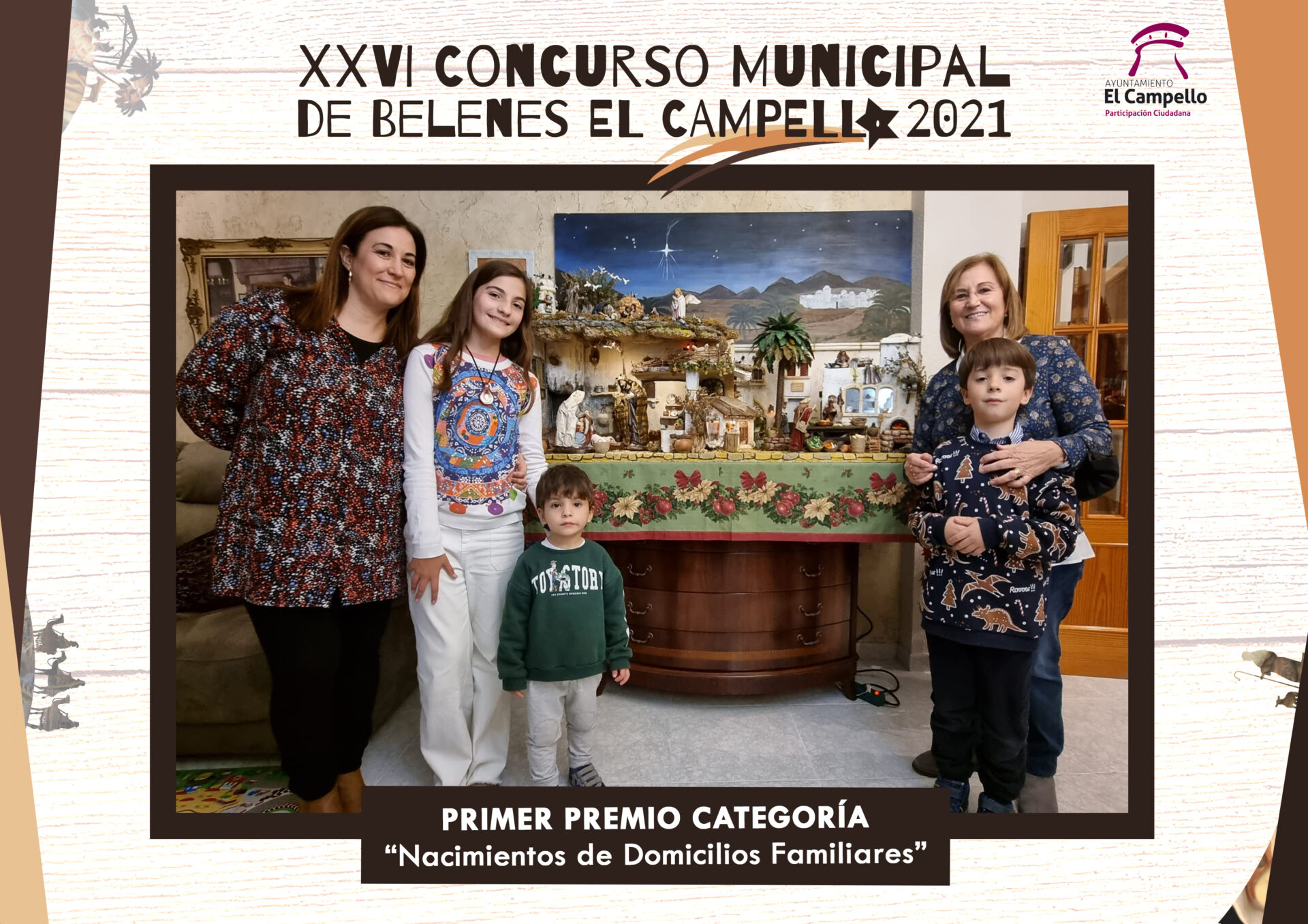 El jurado, integrado por el propio Juanjo Berenguer, el integrante de la Asociación Belén Municipal Francisco Climent, y la ilustradora profesional María José Pérez, decidió conceder el primer premio, en la categoría de instalaciones familiares, a la propuesta de Natividad Martínez, de la que se valora la armonía del conjunto y la coherencia de las escenas.