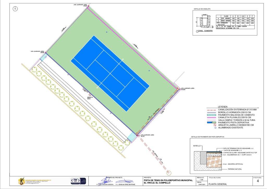 Ahora, la zona en la que se actuará se concreta en el área vallada de la pista de tierra batida situada dentro del recinto. Se opta por realizar una pista de tenis de resinas sintéticas que cumpla en planta con las condiciones de normas NIDE 2005.