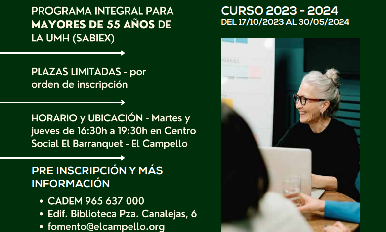 La concejalía de Fomento y Empleo que dirige Marisa Navarro, comunica que el próximo lunes, 18 de septiembre, y hasta el 3 de octubre, estará abierto el plazo de matriculación de las llamadas “aulas de la experiencia”, un programa integral de formación para mayores de 55 años. Las plazas son limitadas, y se cubrirán de acuerdo al orden de inscripción. Las matrículas pueden tramitarse de forma presencial (en las dependencias del CADEM), o vía online en fomento@elcampello.org.