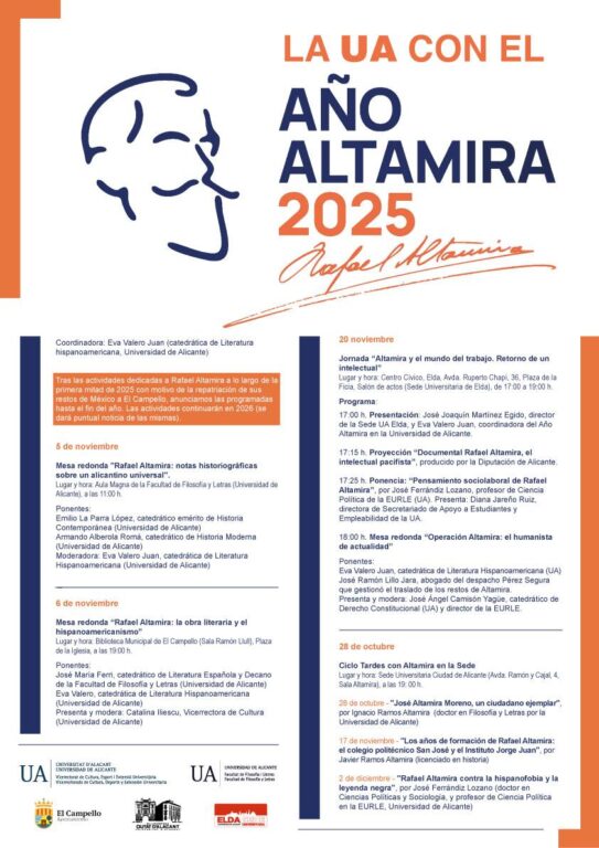 El ciclo “La UA con el Año Altamira”, impulsado por la Universidad de Alicante, marcará el inicio de la programación. Las jornadas se celebrarán los días 28 de octubre, 17 de noviembre y 2 de diciembre en la Sede Universitaria de Alicante, con la participación de profesores y expertos en Filosofía, Historia, Ciencias Políticas y Literatura Hispanoamericana. Las sesiones estarán coordinadas por la catedrática Eva Valero, responsable de la dirección académica de este proyecto.