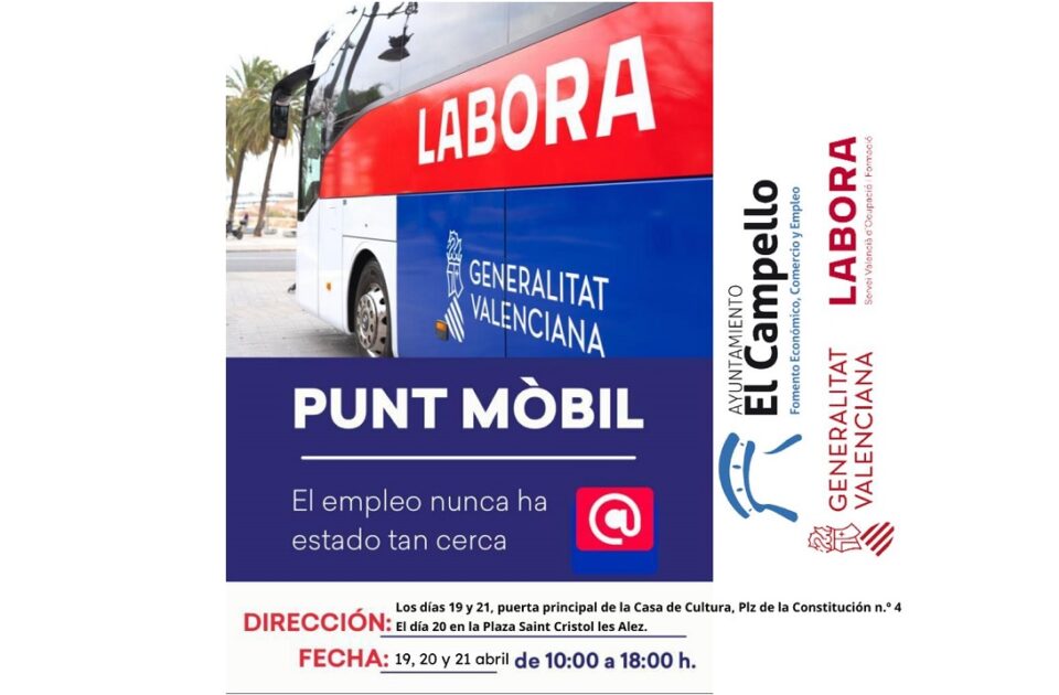 El Campello recibirá los días 19, 20 y 21 de abril, de 10.00 a 18.00 horas, la visita del autobús itinerante de “Labora” de la Generalitat Valenciana, un vehículo equipado y adaptado como oficina ‘Espai Labora’ en el que personas especializadas ofrecen ayuda a la población.