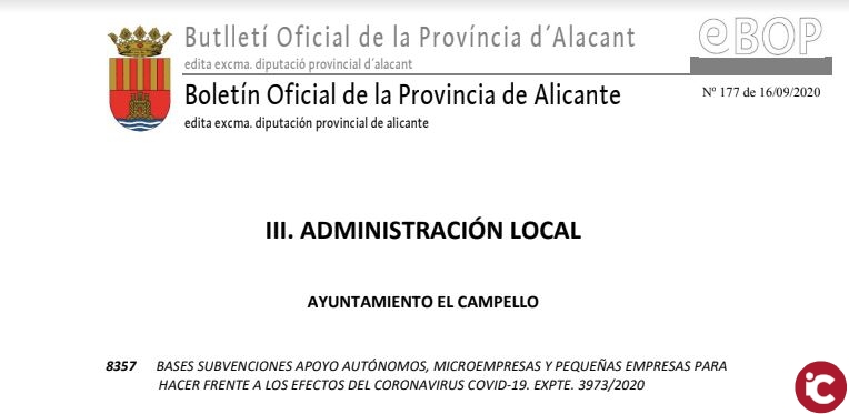 El Boletín Oficial de la Provincia (BOP), ha publicado ya las bases que regulan las subvenciones de apoyo a autónomos, microempresas y pequeñas empresas afectados por la crisis económica sobrevenida por la pandemia del COVID-19 dispuestas por el Ayuntamiento de El Campello. La concejala de Fomento Económico y Comercio, Maricarmen Alemañ (PP), hace un llamamiento a los interesados para que preparen con carácter inmediato la documentación que se requiere, al objeto de estar preparados para cuando, dentro de muy pocos días, puedan comenzar a tramitarse las solicitudes, proceso que se prolongará por espacio de dos semanas. Se recuerda que se destina a este cometido un total de 765.000 euros, cantidad que convierte a El Campello en uno de los municipios que más dinero destina a este cometido.