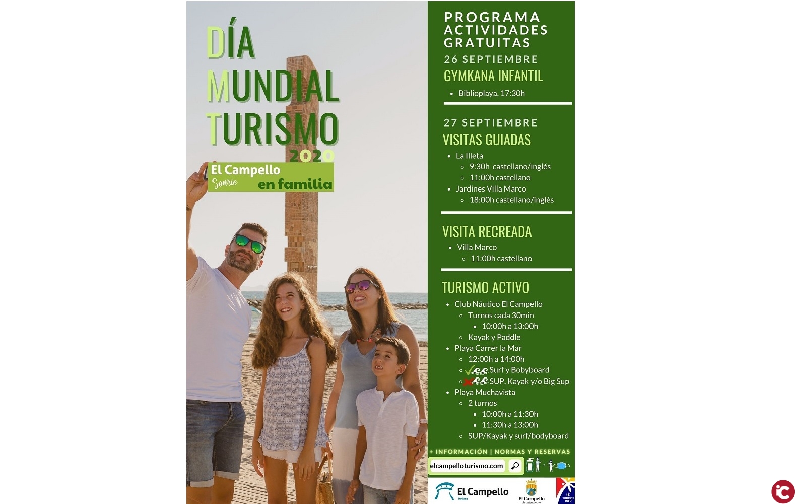 Ya está todo preparado en El Campello para conmemorar el Día Internacional del Turismo 2020, el domingo 27 de septiembre. La concejalía de Turismo que dirige Marisa Navarro ha organizado una serie de eventos, gratuitos, destinados a ofrecer una amplia gama de actividades a las familias residentes y turistas, que se sucederán durante las jornadas del sábado y el domingo.