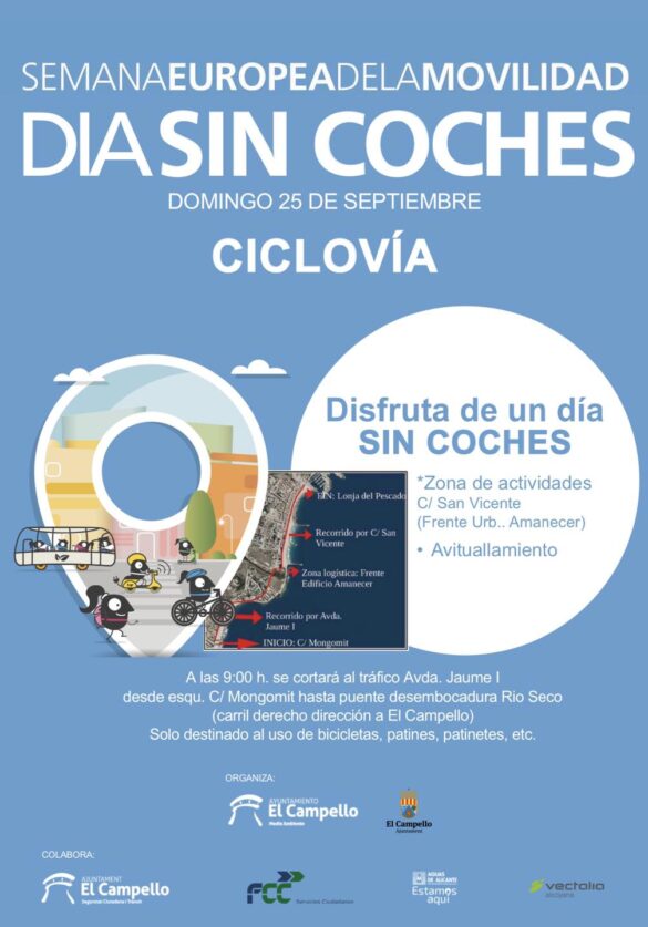Por otra parte, el domingo día 25 se llevará a cabo una marcha en bicicleta, patines y patinetes que recorrerá, a partir de las 9:00 horas, la Avenida Jaume I desde la calle Mongomit hasta el puente de la desembocadura del Rio Seco (carril derecho dirección a El Campello). Se trata de una nueva edición de la conocida como ”Ciclovía”, que plantea disfrutar de un día sin coches al menos en ese importante vial. Se dispondrá una zona de actividades en la calle San Vicente, frente a la urbanización Amanecer, y participan las mismas firmas apuntadas en el párrafo anterior.
