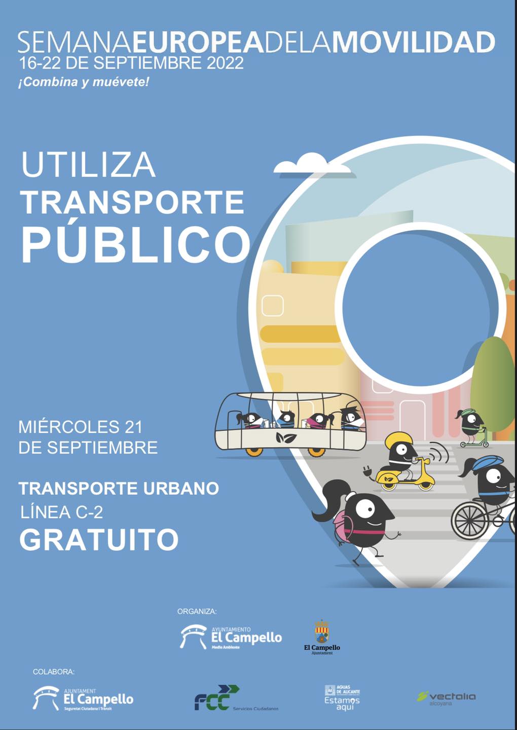 Del 16 al 22 de septiembre se celebra la Semana Europea de la Movilidad, a la que se suma El Campello con dos propuestas de interés social. La primera de ellas será la jornada del miércoles 21 de septiembre, cuando la línea de autobús C-2 será gratuita para todos los usuarios. Esta acción es posible gracias a la implicación del Ayuntamiento, la compañía Aguas de Alicante y las firmas Vectalia y FCC.