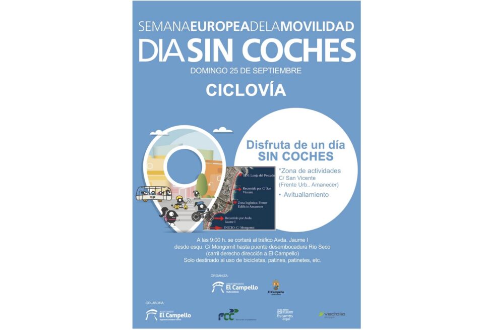 Por otra parte, el domingo día 25 se llevará a cabo una marcha en bicicleta, patines y patinetes que recorrerá, a partir de las 9:00 horas, la Avenida Jaume I desde la calle Mongomit hasta el puente de la desembocadura del Rio Seco (carril derecho dirección a El Campello). Se trata de una nueva edición de la conocida como ”Ciclovía”, que plantea disfrutar de un día sin coches al menos en ese importante vial. Se dispondrá una zona de actividades en la calle San Vicente, frente a la urbanización Amanecer, y participan las mismas firmas apuntadas en el párrafo anterior.