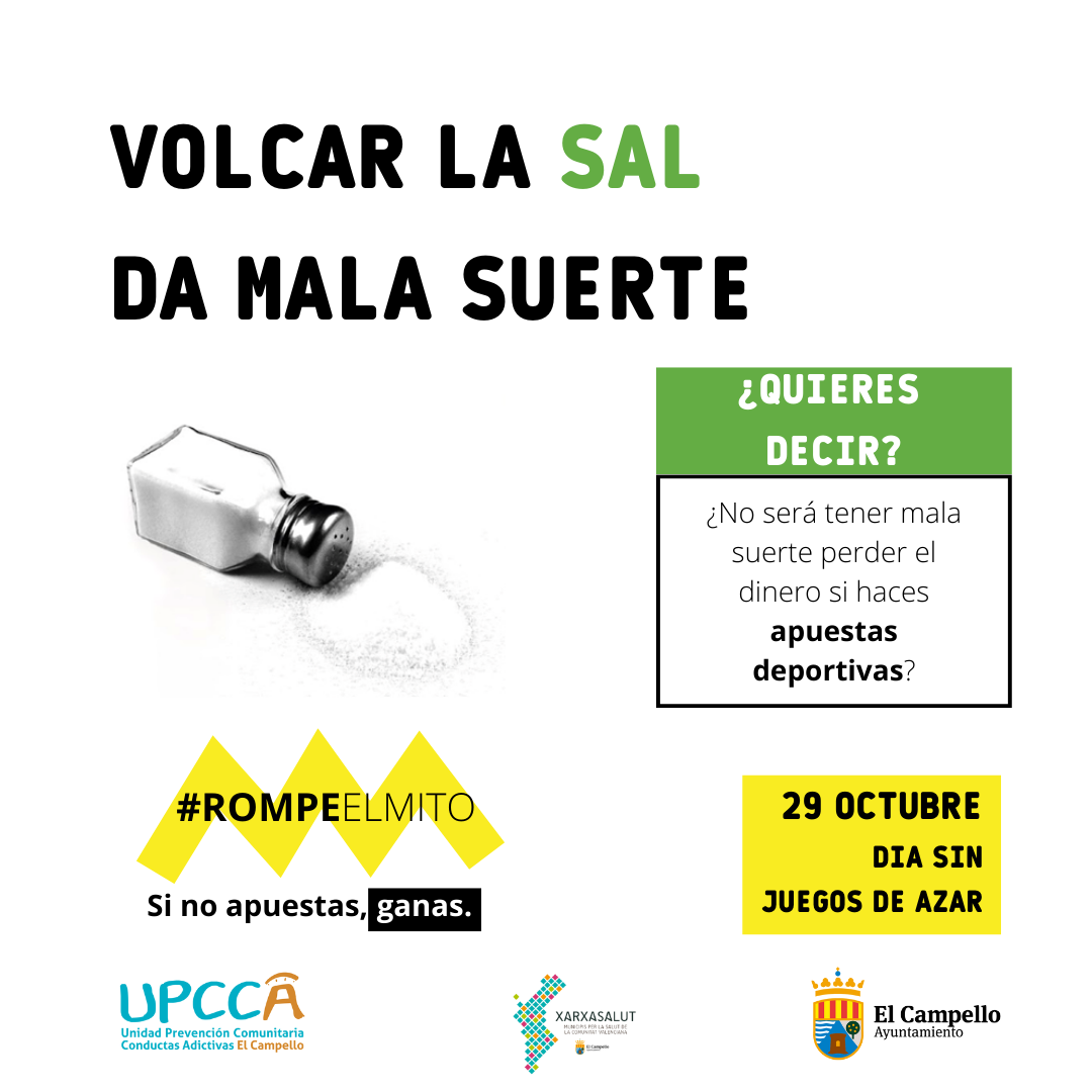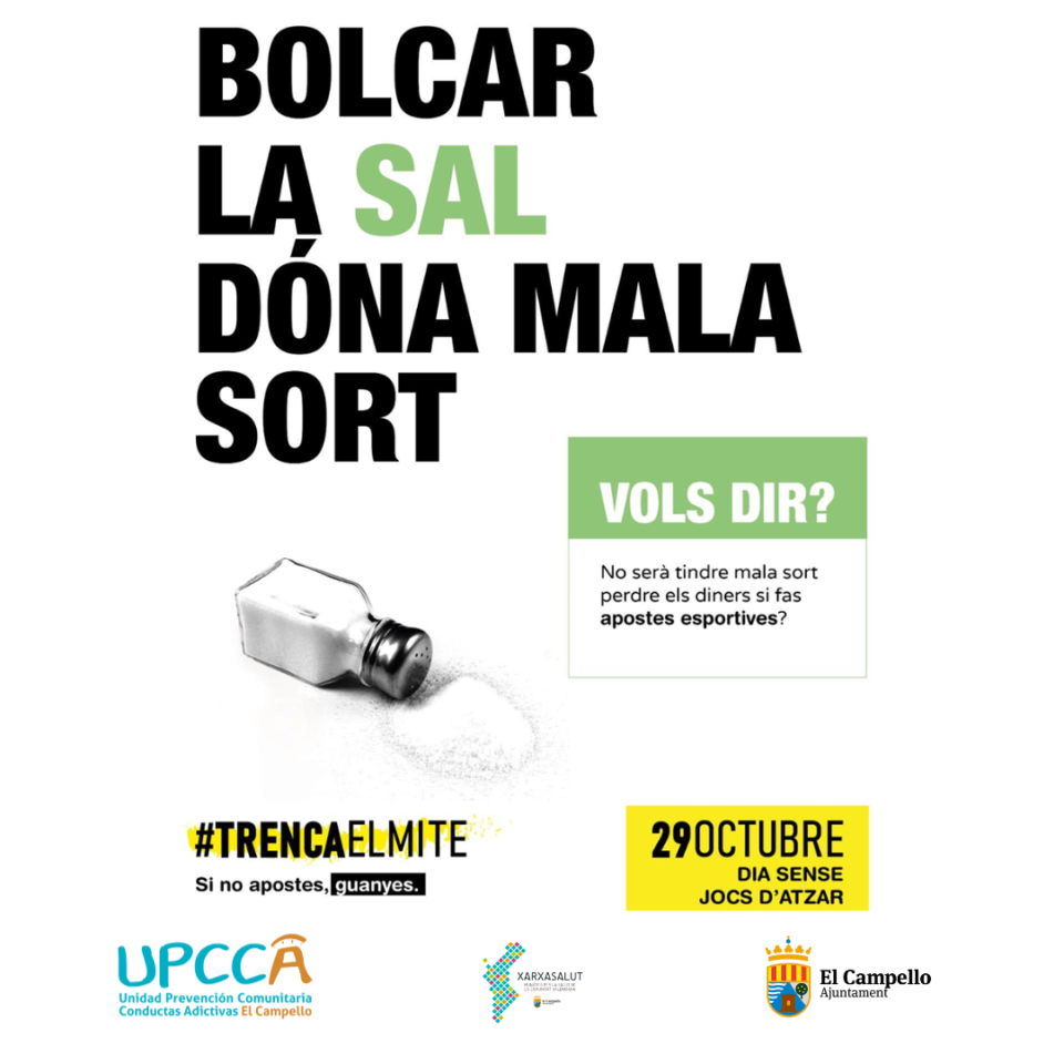 La Red de UPCCA’s de la Comunidad Valenciana (unidades de prevención de conductas adictivas) se une a la campaña de concienciación del 29 de octubre, Día Nacional sin juego de azar. La unidad de El Campello, que dirige la concejala Maricarmen Alemañ (PP) señala que el objetivo de la campaña es concienciar a la población de los riesgos y efectos nocivos que el juego de azar  está produciendo en la población, tanto presencial como virtual a través de las apuestas online. Esta campaña desarrollada a través de las redes sociales, se enfoca en desmontar las ideas irracionales que la mayoría de las personas con ludopatía tienen sobre el efecto de la suerte, buena o mala, para conseguir un dinero presuntamente rápido y fácil.