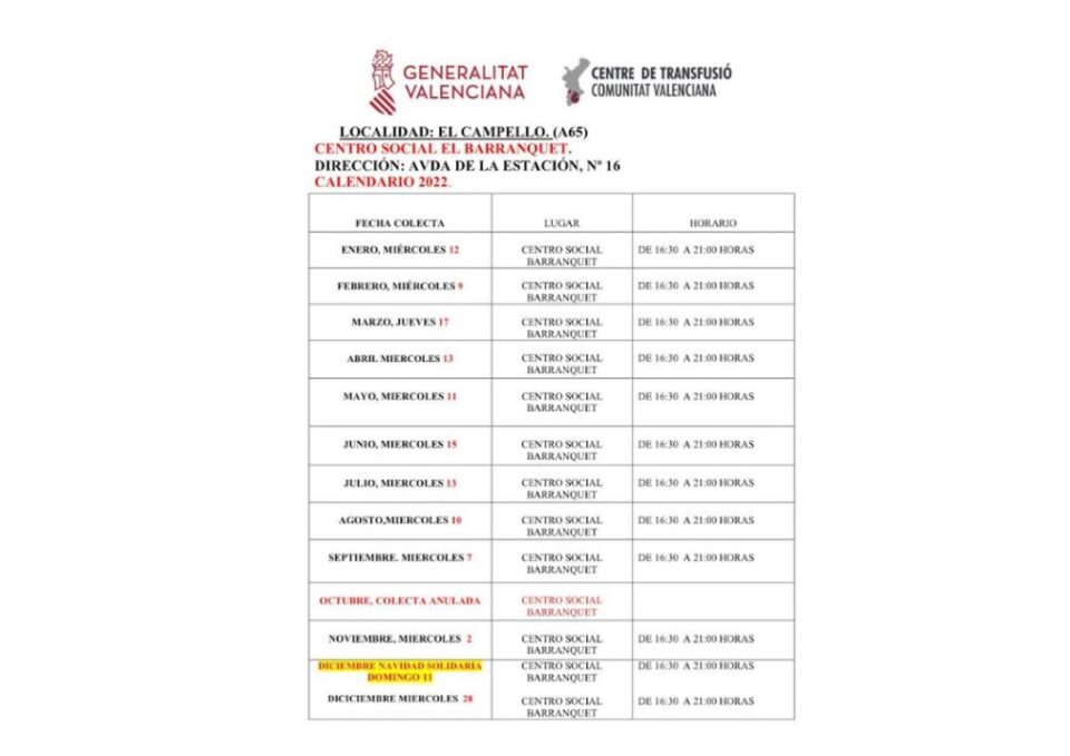 La concejalía de Salud Pública que dirige Rafa Galvañ (PP), comunica que el Centro de Transfusión de la Comunidad Valenciana, dependiente de la Conselleria de Sanidad, ha hecho público su calendario de donaciones previstas para El Campello durante el ejercicio 2022 que acaba de comenzar.