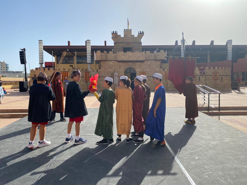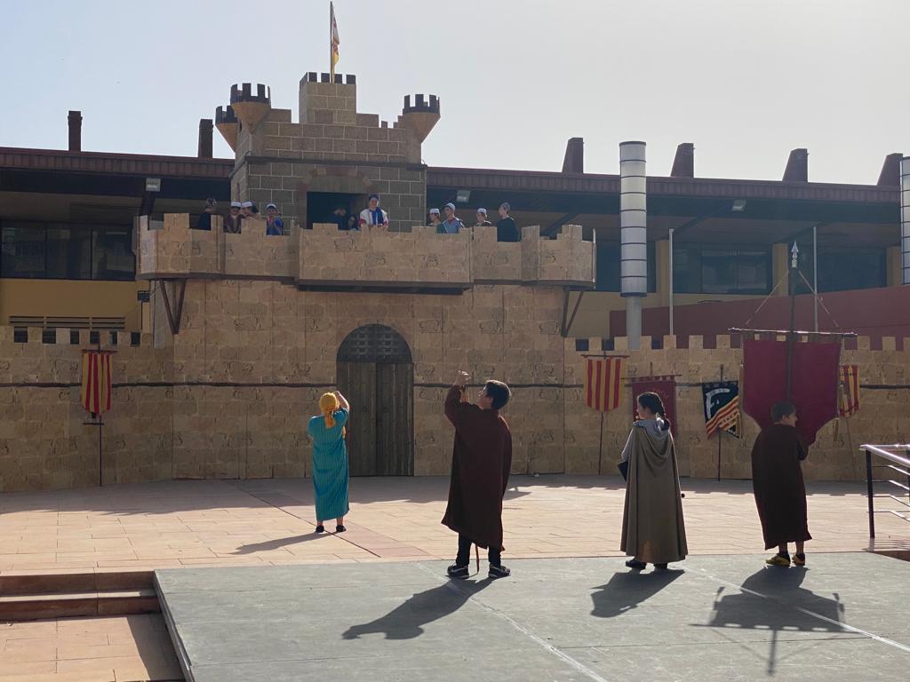Frente al castillo de las fiestas de Moros y Cristianos, docentes y alumnos de los cursos 4º y 5º han asistido hoy a la representación, encarnando la figura de Jaume I en esta ocasión una niña del colegio público Fabraquer, centro al que le ha correspondido organizar la representación.