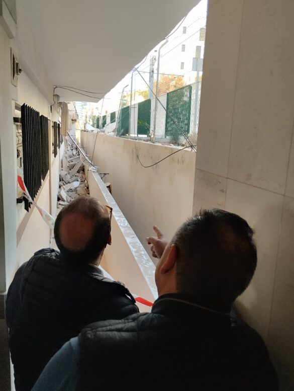 Aunque la realmente afectada ha sido la parte sur del edificio, se ha optado por precintar el inmueble en su integridad. Se trata de una finca construida hace décadas, reformada en parte hace unos cinco años. Aunque la entrada es por la fachada que da al mar, realmente a las viviendas se accede por la parte trasera, a través de pasillos y voladizos, que son los que han cedido sin que de momento se conozcan las causas.