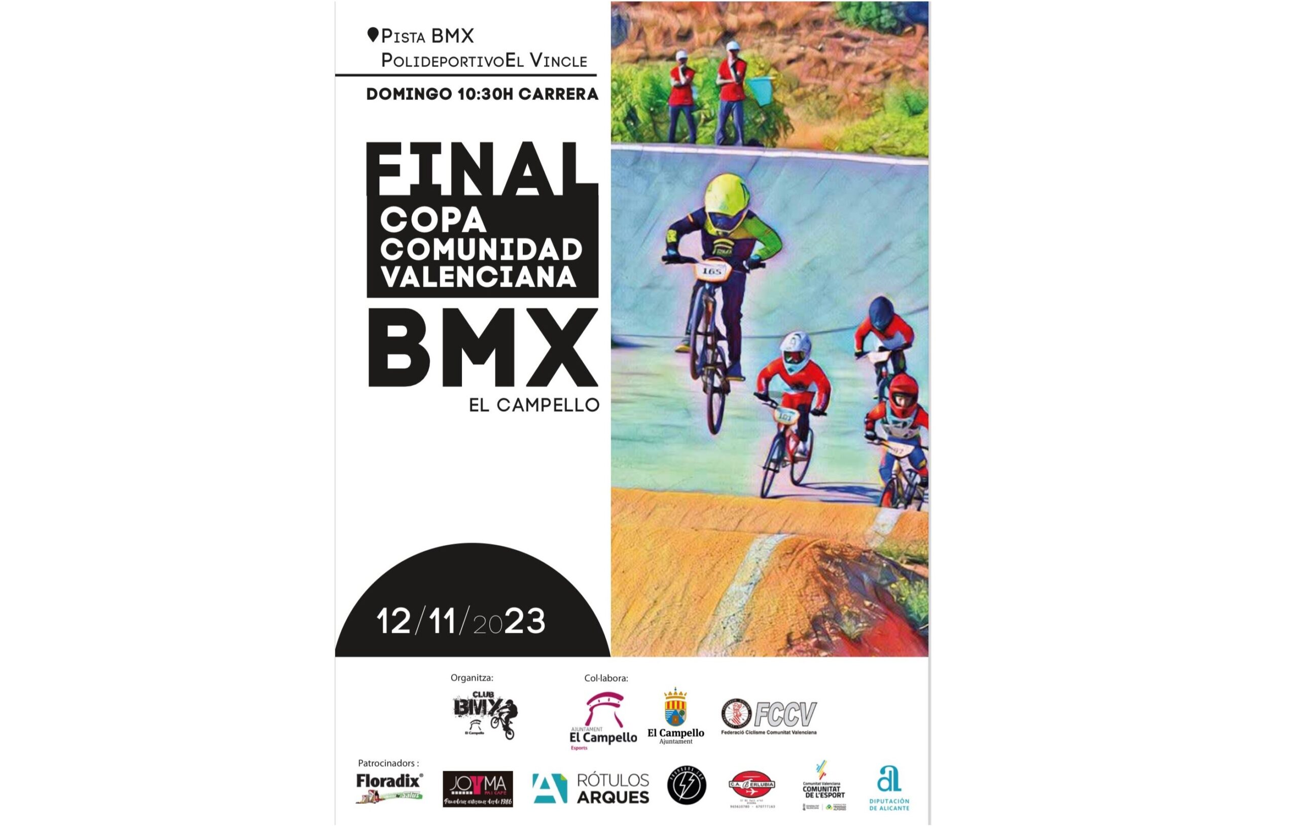 En la pista de BMX junto al polideportivo El Vincle, este domingo 12 de noviembre se disputará en El Campello la final de la Copa Comunidad Valenciana de BMX, organizada por el Club BMX local, que cuenta con la colaboración de la concejalía de Deportes que dirige Cristian Palomares, la Federación Valenciana de Ciclismo y diversas firmas comerciales del municipio.