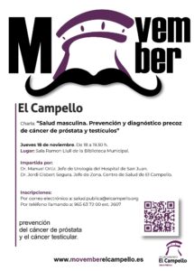 Este año el acto principal será el jueves, día 18, para el que se ha programado, a las 18:00 horas en la sala Ramón Llull de la Biblioteca Municipal, una charla titulada “Salud masculina: prevención y diagnóstico precoz de cáncer de próstata y testículos`”, que impartirán el doctor Manuel Ortiz, jefe de Urología del Hospital de San Juan, y el doctor Jordi Gisbert Segura, jefe de Zona del Centro de Salud de El Campello.