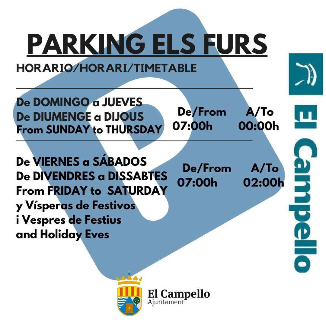 El Ayuntamiento de El Campello comunica que a partir del próximo lunes, 19 de septiembre, se modifican los horarios de apertura del parking público de Els Furs.