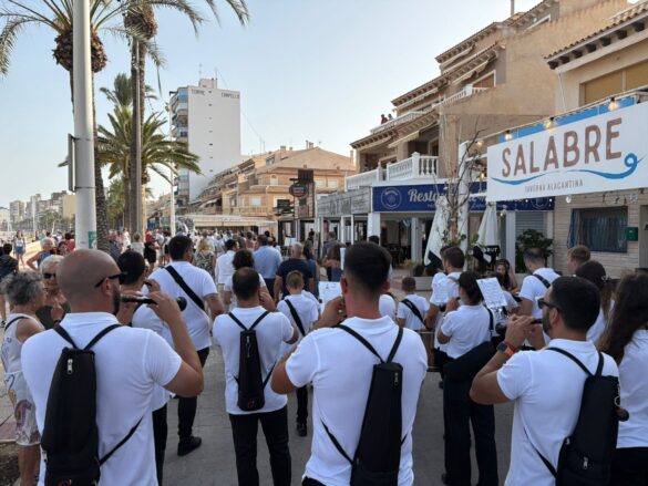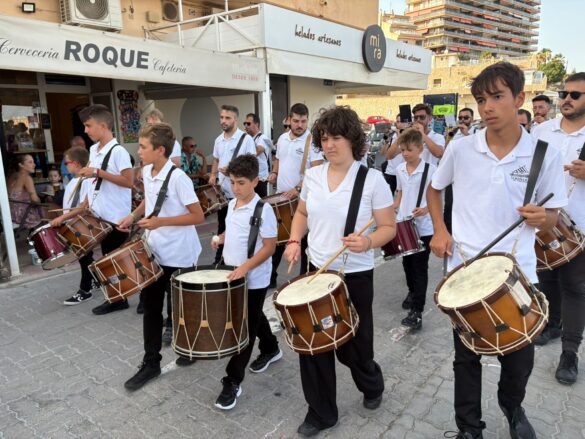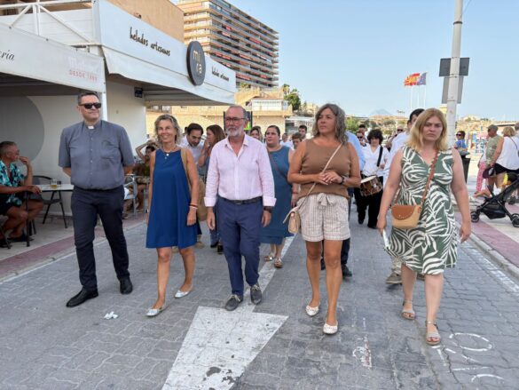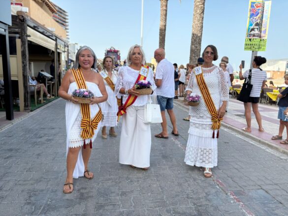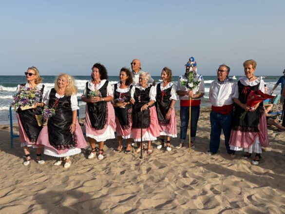 Previamente a la ofrenda sobre la misma arena de la playa de Carrer la Mar, autoridades, integrantes de la Asociación que preside Agnés Villa, reina y damas de la entidad, los que ostentan el cargo de “abuelos” en este 2025, devotos y público en general hicieron un recorrido en pasacalles desde la Penyeta hasta el monumento, levantado en la misma playa, y, a esa hora, con muchos bañistas.