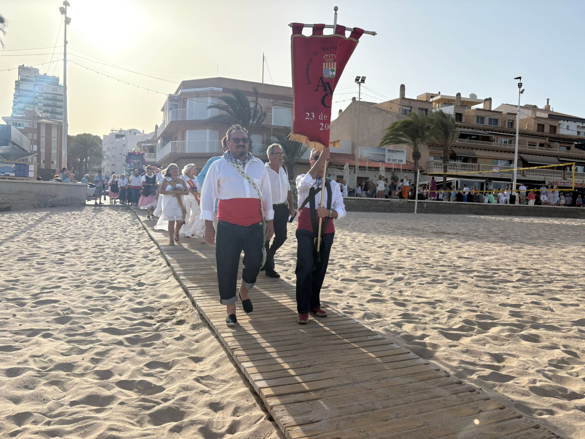 Previamente a la ofrenda sobre la misma arena de la playa de Carrer la Mar, autoridades, integrantes de la Asociación que preside Agnés Villa, reina y damas de la entidad, los que ostentan el cargo de “abuelos” en este 2025, devotos y público en general hicieron un recorrido en pasacalles desde la Penyeta hasta el monumento, levantado en la misma playa, y, a esa hora, con muchos bañistas.