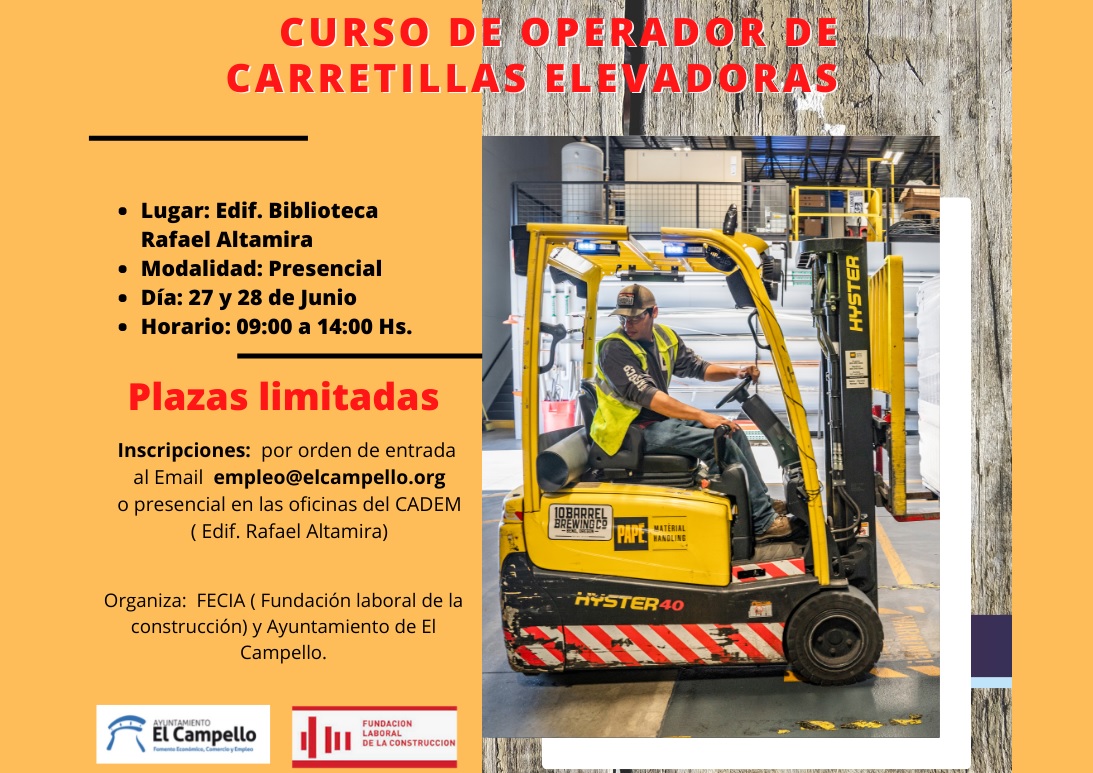 Con el objetivo de adquirir las competencias necesarias para la utilización segura y responsable de la carretilla elevadora, con control total de cargas y seguridad en los diferentes entornos de trabajo, y más concretamente conocer de forma general las modalidades, condicionantes y riesgos asociados a las distintas operaciones de manipulación de cargas, la concejalía de Fomento Económico y Empleo que dirige Marisa Navarro (PP), oferta un curso intensivo que tendrá lugar los días 27 y 28 de junio en las instalaciones de la Biblioteca Municipal.