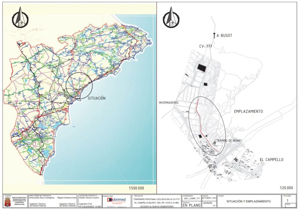 La carretera CV-777, cuya titularidad corresponde a la Diputación de Alicante, discurre entre las localidades de El Campello y de Busot. Las actuaciones contenidas en el proyecto consisten en la construcción de un itinerario peatonal-ciclista en la zona adyacente a la carretera, con el fin de conectar el que será el nuevo cementerio de El Campello con la ciudad.